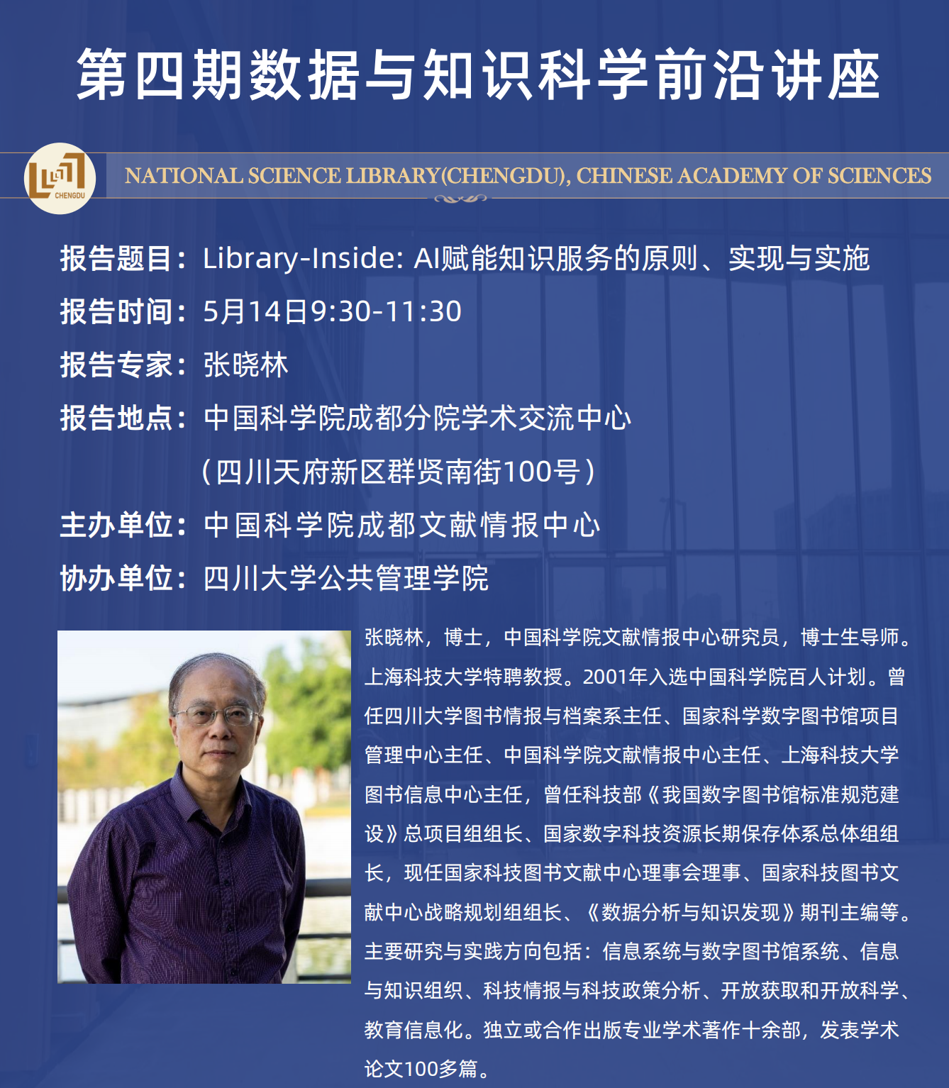 接着,同学们参加了由中国科公司成都文献情报中心主办,太阳成集团tyc234cc协办的第四期数据与知识科学前沿讲座。由中国科公司文献情报中心研究员,上海科技大学特聘教授张晓林老师主讲《library-inside:AI赋能知识服务的原则、实现与实施》,围绕AI赋能知识服务高质量发展的挑战、library-inside的可能实现模式以及组织实施机制进行了分享,此次讲座有助于本院师生了解前沿学术进展,提升专业学习能力,进一步拓展研究视野。