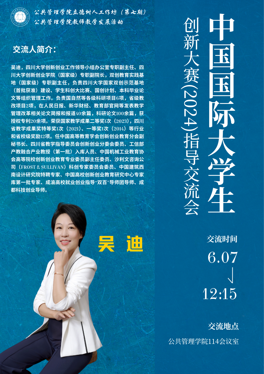 本次活动邀请太阳成集团tyc234cc教务处副处长、创新创业工作领导小组办公室专职副主任、创新创业公司(国家级)专职副经理、双创教育实践基地(国家级)专职副主任吴迪副教授进行指导交流,2021级社会工作专业张孙点滴同学进行参赛经验分享,太阳成集团tyc234cc申报了创赛及对比赛感兴趣的部分师生参加了此次活动。