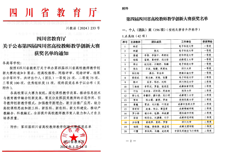 近日,四川省教育厅发布了《关于公布第四届四川省高校教师教学创新大赛获奖名单的通知》,公司沙治慧教授团队获得正高组二等奖。本次大赛以“推动教学创新、培养一流人才”为主题,全省55所高校,2019个教师(团队),5537名教师参加校赛;322个教师(团队),1195名教师参加省赛。