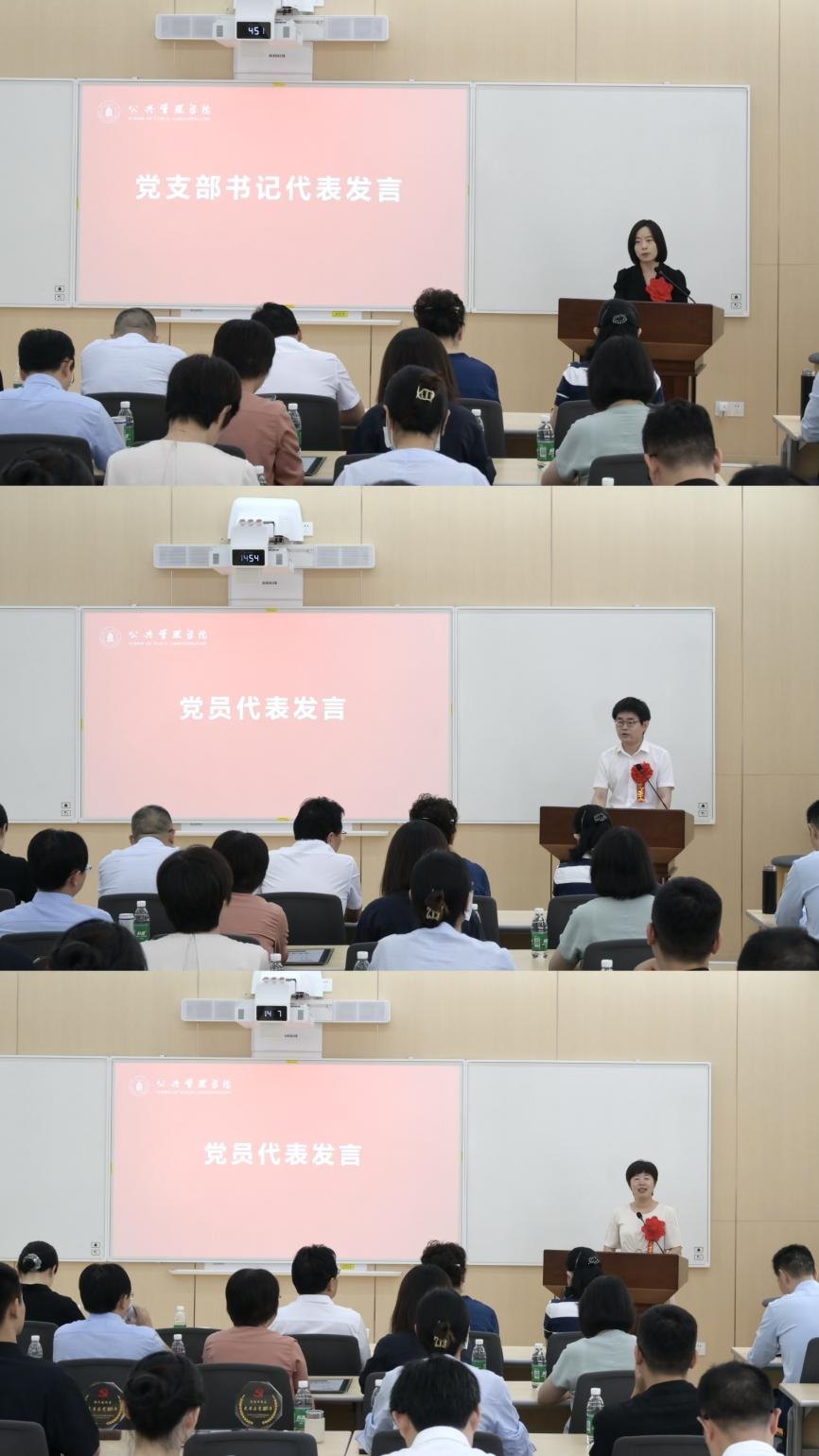 公司先进党支部代表、行政管理系支部书记李晓梅,优秀共产党员代表、博士生第一支部丁亮和党龄整十年党员同志代表、信息资源管理系支部李桂华分别发言,分享所思所想所悟。