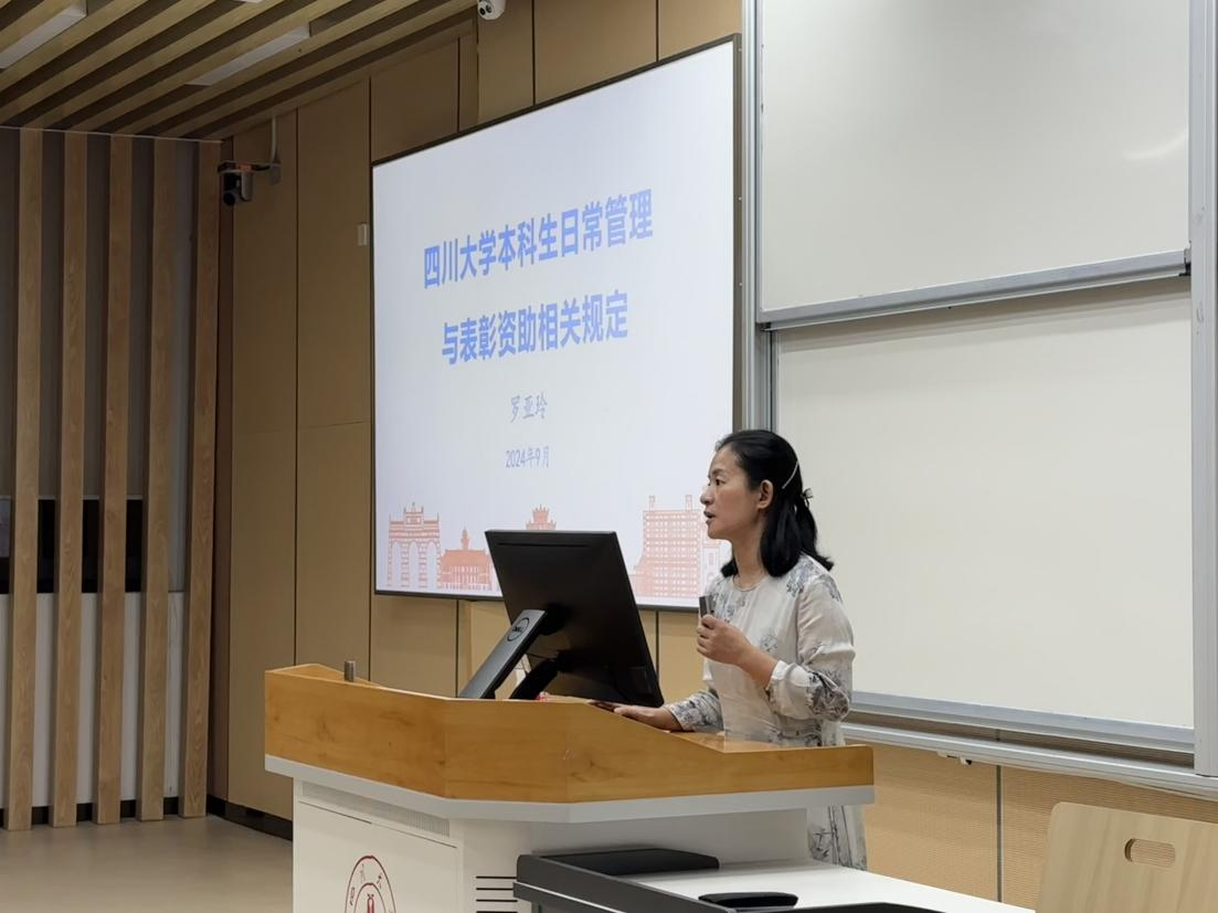 罗亚玲为家长深度讲解了本科生日常管理与表彰资助的相关规定,介绍了教务管理及教育规划,要求员工牢记“四个安全”、遵守公司规定,并勉励同学们追求卓越、勇于突破,成为担当民族复兴大任的时代新人。
