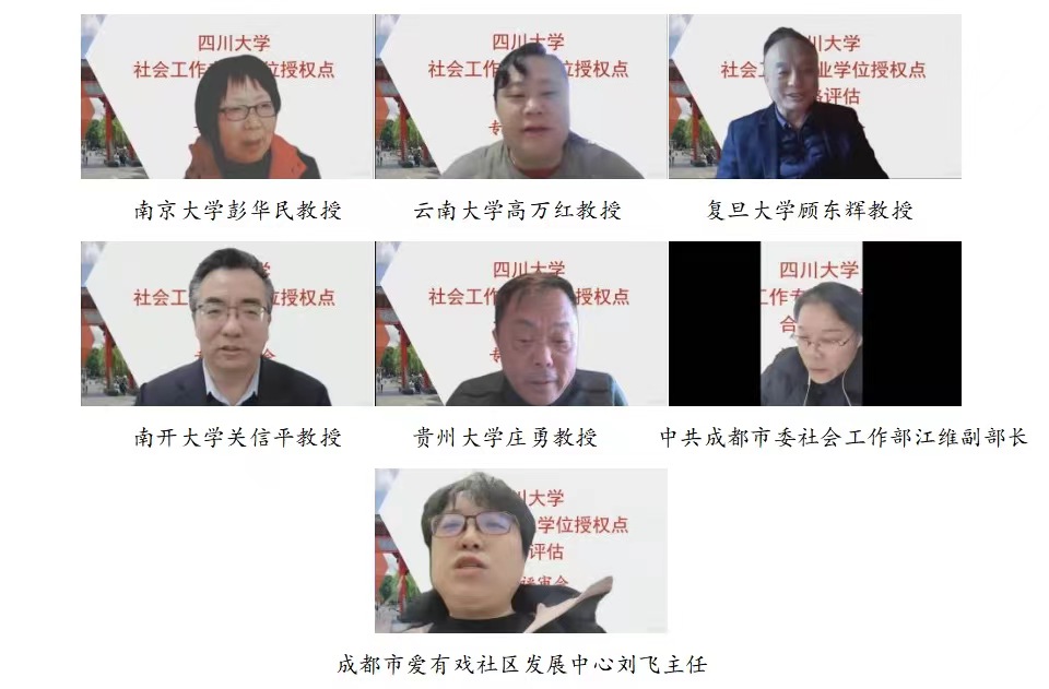 在顺利完成社会学学位授权点的评估后,社会工作专业硕士学位授权点开展评估工作。评审专家组由南京大学彭华民教授担任组长,云南大学高万红教授、复旦大学顾东辉教授、南开大学关信平教授、贵州大学庄勇教授、中共成都市委社会工作部江维副部长、成都市爱有戏社区发展中心刘飞主任为成员,对公司社会工作专业硕士学位授权点在2020-2025学年度的建设情况进行全面考察和评价。何明洁副教授代表社会工作专业硕士点汇报自评情况。