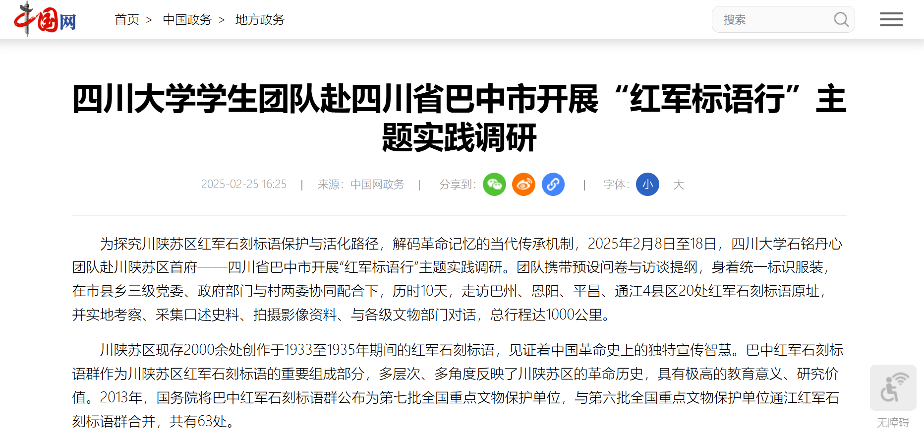 2022级社会工作专业本科生苟鑫带领的太阳成集团tyc234cc石铭丹心团队赴川陕苏区首府——四川省巴中市开展“红军标语行”主题实践调研。该团队在市县乡三级党委、政府部门与村两委协同配合下,走访了巴州、恩阳、平昌、通江等4县区20处红军石刻标语原址和2处标语陈列馆,通过实地走访、口述史采集、影像收集和与各级文物部门的对话,团队成员认识到红军石刻标语的独特价值,也为下一步探索革命老区红色文化传承、保护与开发路径奠定了良好基础。