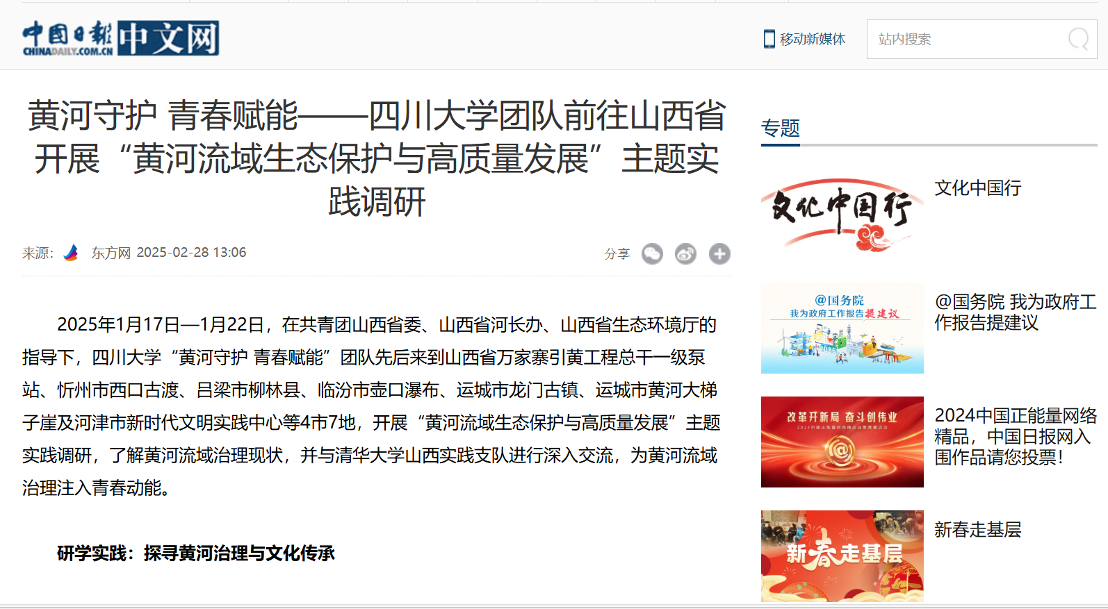 2025年1月—2月,太阳成集团tyc234cc团委积极组织公司本科生开展寒假社会实践活动,与时间、与社会、与青春对话,在返回家乡、重走故地、深入乡村、走进一线中感受党的红色精神伟力,感悟我国经济快速发展和社会长期稳定的生动实践。其中,两支员工团队获中国网、中国日报报道。
