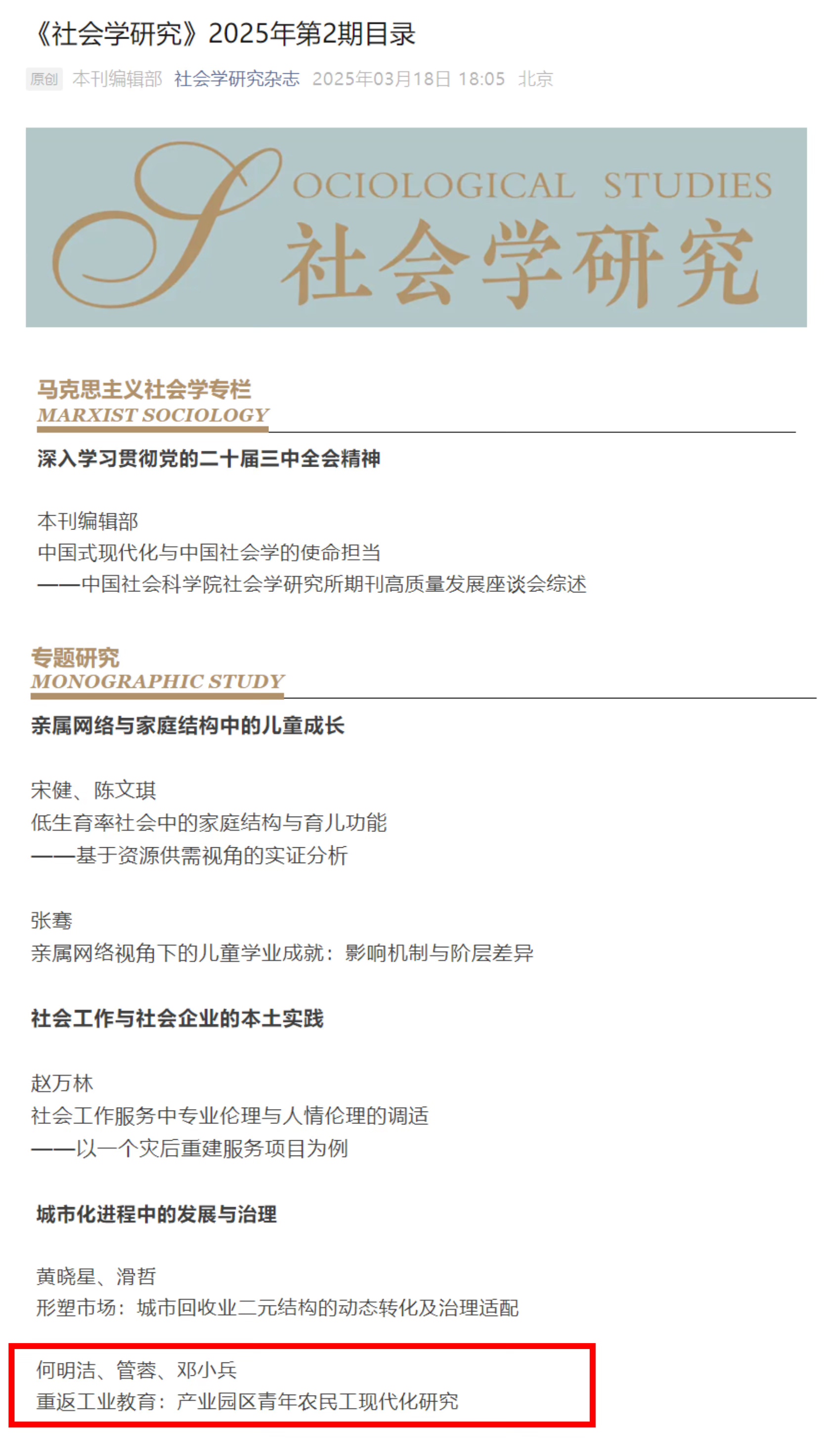 近期,公司何明洁副教授与2023届社会学硕士研究生管蓉、成都市锦江区教育科学研究院邓小兵合作完成的论文《重返工业教育:产业园区青年农民工现代化研究》发表于社会学领域权威期刊《社会学研究》2025年第2期。