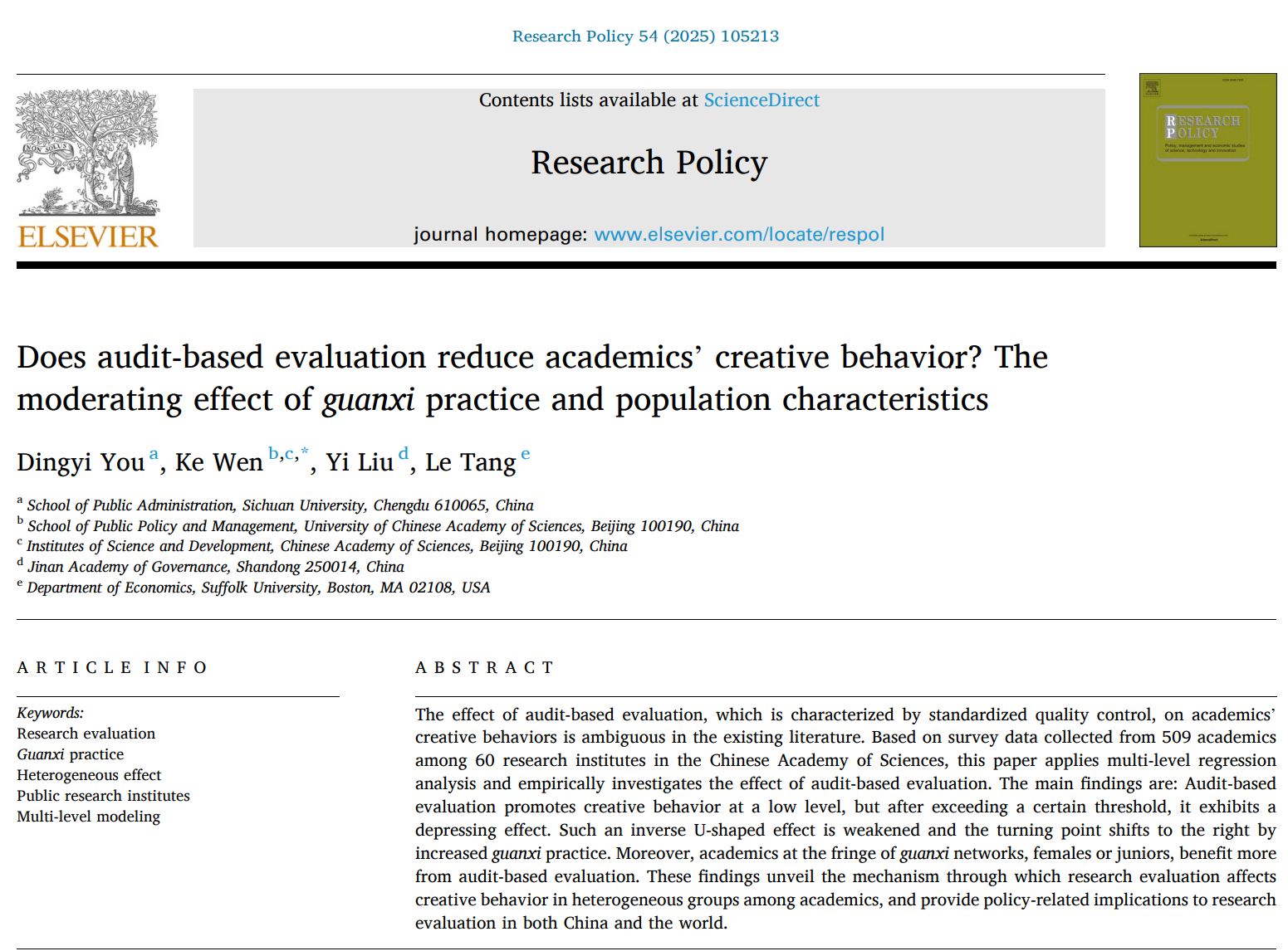 近日,公司行政管理系游玎怡特聘副研究员作为第一作者,在科技管理领域国际顶级学术期刊《Research Policy》发表题为《Does audit-based evaluation reduce academics' creative behavior? The moderating effect of guanxi practice and population characteristics》的研究论文。《Research Policy》主要刊发科研政策、技术创新、环境等多学科方面的研究论文,致力于分析和理解经济、政策、管理、环境等方面的问题,以其跨学科研究特色和高学术影响力著称,在创新研究领域具有标杆地位。这是公司首次在该期刊发表研究成果。