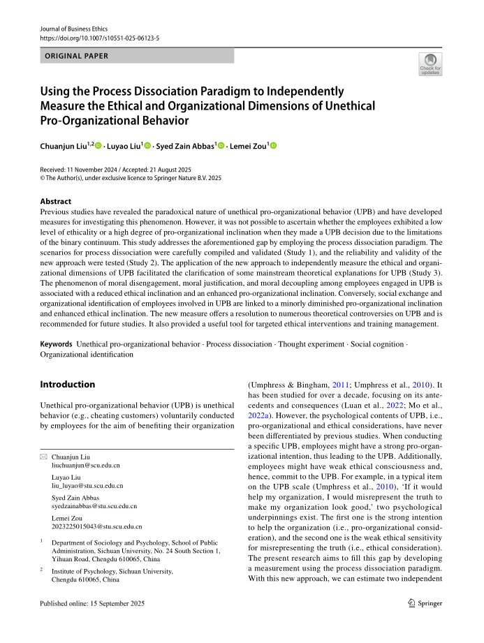 Liu, C.*, Liu, L., Abbas, S., Z., & Zou, L. (2025). Using the Process Dissociation Paradigm to Independently Measure the Ethical and Organizational Dimensions of Unethical Pro-organizational Behavior. Journal of Business Ethics. Advance online publication. https://doi.org/10.1007/s10551-025-06123-5