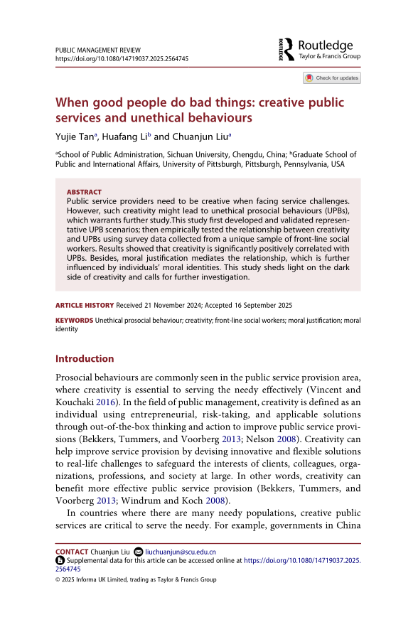 Tan, Y., Li, H., & Liu, C.* (2025). When Good People Do Bad Things: Creative Public Services and Unethical Behaviours. Public Management Review. Advance online publication. http://doi.org/10.1080/14719037.2025.2564745