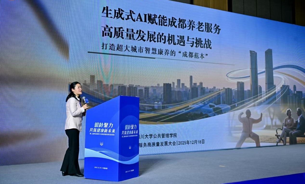 在主旨演讲中,中国人民大学人口与健康公司经理杜鹏教授以人口老龄化趋势与十五五时期养老服务改革发展为主题,结合人口数据与政策导向,剖析了未来养老服务改革的重点方向。罗亚玲教授以《生成式AI赋能成都市养老服务高质量发展的机遇与挑战》为题,从技术与治理深度融合的角度,探讨了生成式AI赋能成都市养老服务高质量发展的机遇,挑战与破解之道,即如何将生成式AI这一前沿科技转化为支撑成都市高质量养老服务的“新基础设施”,打造超大城市智慧康养的“成都范本”,为成都市养老服务数字化转型提供了兼具理论深度与实践操作性的政策建议。成都医公司潘克俭教授分享了老年健康领域数智人才培养的探索经验。成都中医药大学陈骥教授详细阐述中医药适宜技术在养老服务中的价值与推广路径。四川眉山药科职业公司卢敏董事长则探讨了数智康养人才的产教融合创新实践。