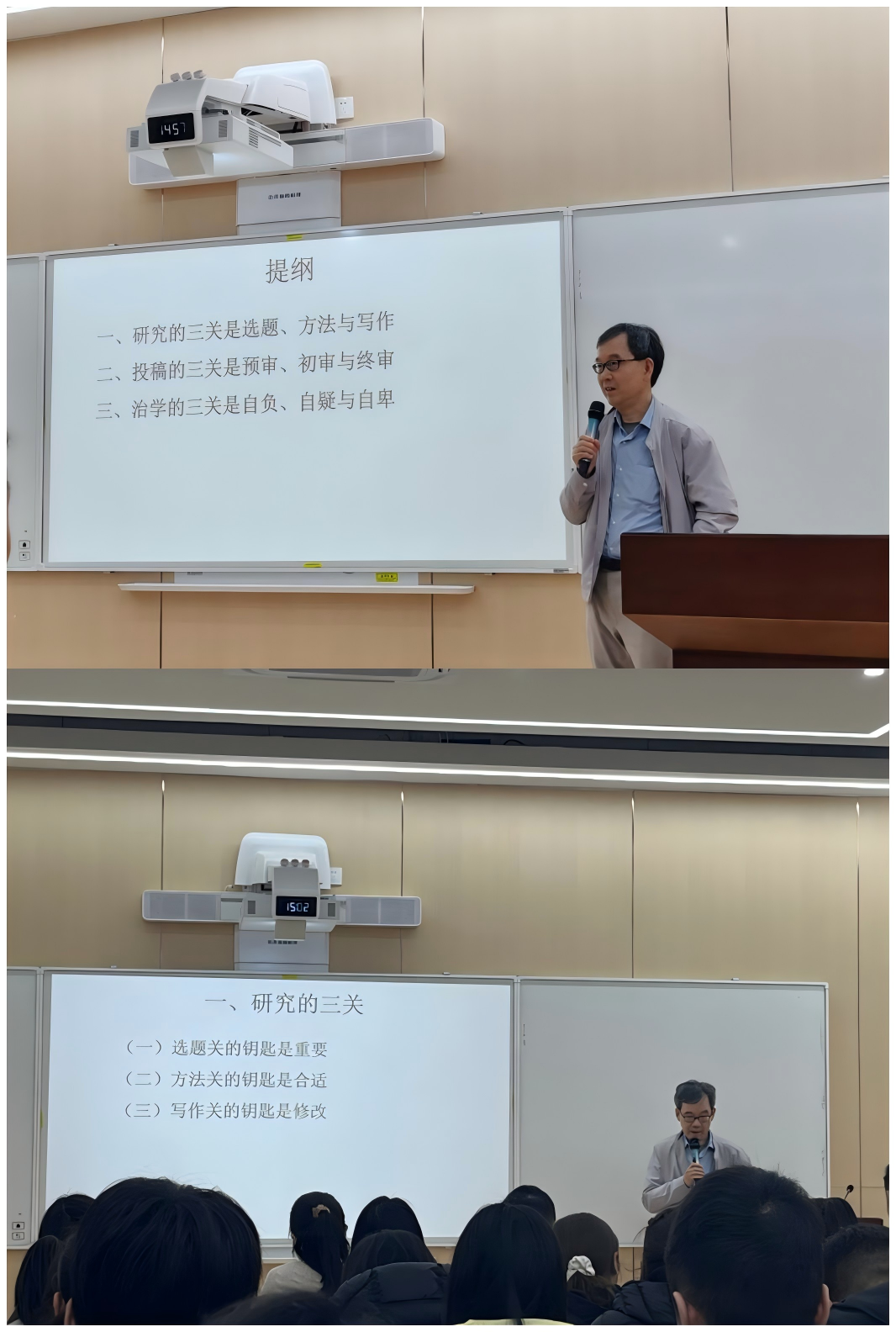 李连江教授结合自身丰富的学术研究与论文发表经验,从研究“三关”、投稿“三关”、治学“三关”进行了深入浅出的阐释。从研究“三关”来看,选题关的钥匙是重要、方法关的钥匙是合适、写作关的钥匙是修改;从投稿“三关”来看,预审关的钥匙是标题、初审关的钥匙是摘要、终审关的钥匙是导言;从治学“三关”来看,自负的钥匙是破除自我迷信、自疑的钥匙是破除权威迷信、自卑的钥匙是破除他人迷信。通过深刻的学术人生启迪,给与会师生们的学术道路指明了方向。