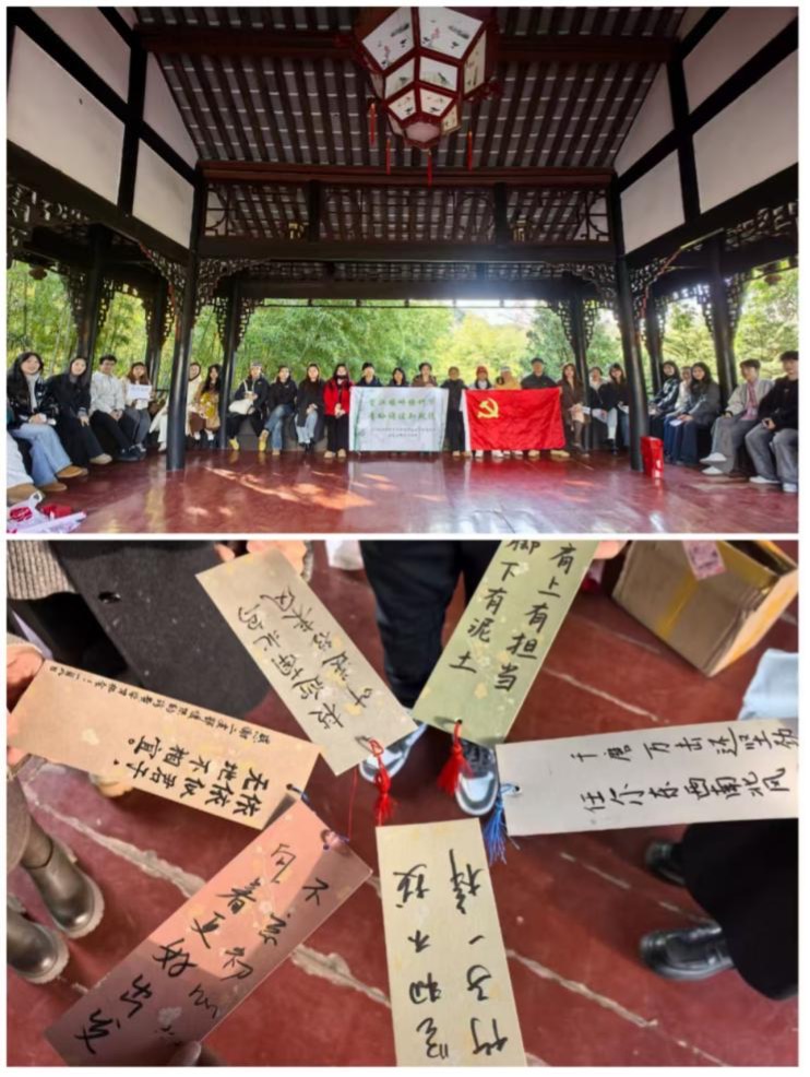 活动伊始,邵而行、杜亚坤作《格竹明志:于历史竹影中照见党员担当》主题演讲,诠释竹之“虚怀求学、坚韧担当、团结同行”三重境界,并感召大家做挺立不倒的“精神竹竿”。随后,大家参观薛涛纪念馆,聆听唐代女诗人薛涛生平事迹,体味其“苍苍劲节奇”的咏竹情怀。在“竹节抢答赛”与“竹简密码”的互动环节,开展党的知识竞赛、研学《习近平谈治国理政》(第五卷)中关于“竹子气节”的论述,深化对清廉从政与为政之德的理解,并纷纷在竹简书签上书写“入党初心与承诺”,铭记入党使命与担当。