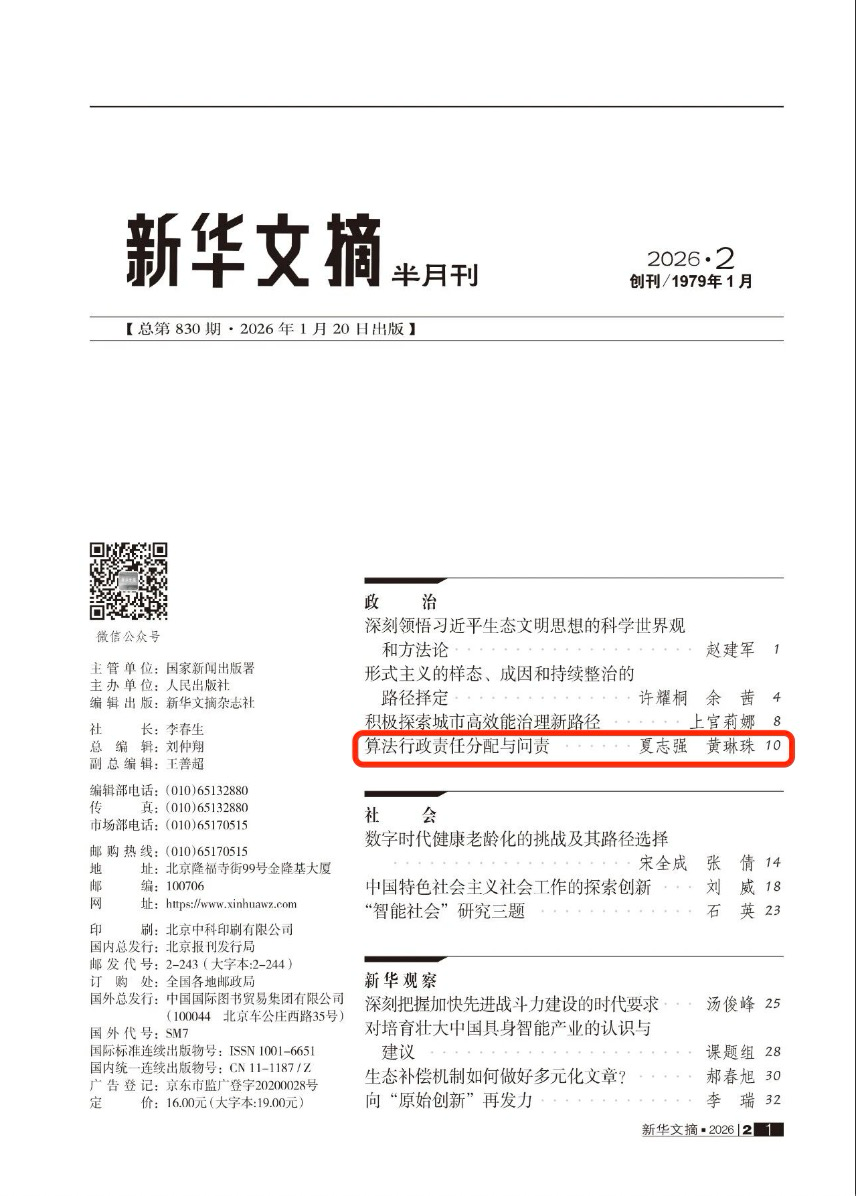 2026年1月出版的《新华文摘》(2026年第2期)转载了公司夏志强教授的论文《算法行政责任分配与问责》。