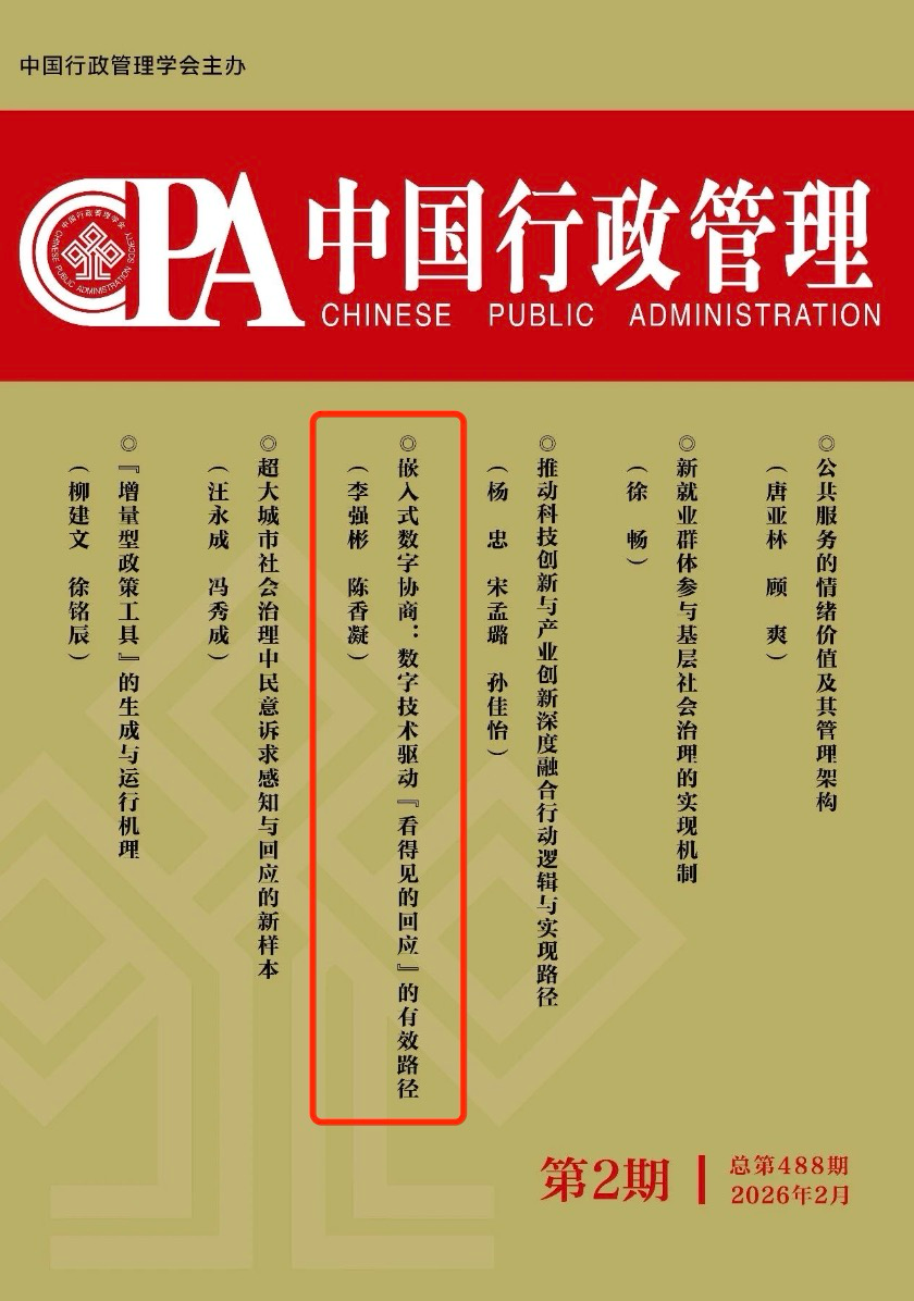近日,公司李强彬教授和博士研究生陈香凝在公共管理权威期刊《中国行政管理》2026年第2期发表论文《嵌入式数字协商:数字技术驱动“看得见的回应”的有效路径》。