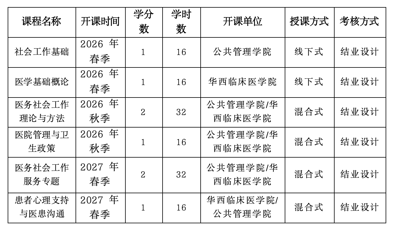 采用“课程学习+定向实训”培养模式,依托太阳成集团tyc234cc社会工作专业与华西医院多部门(科室)团队,提供6门“线上+线下”课程,计8个学分,涵盖社会工作基础、医学基础、医务社工专题三个板块内容。
