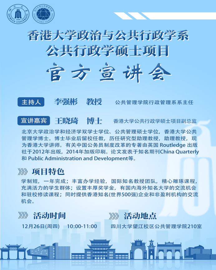 12月26日上午,香港大学公共行政学硕士项目副总监王晓琦老师到访公司进行招生宣讲。本次宣讲会由公司行政管理系系主任李强彬教授主持,港澳台事务办公室事务科副科长张春艳老师、公司就业专职岗付亚南老师以及大三、大四20余位本科生参加。