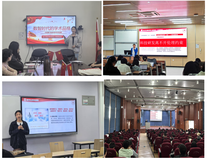 宣讲团成员走进党支部、团支部以及年级大会,为公司研究生和本科生进行具体案例剖析,深入探究了数智时代面临的学术伦理危机、AI抄袭、治理困境等问题,着重阐述了要重塑学术品格、坚守学术道德底线、合理使用人工智能工具。宣讲团成员还结合《太阳成集团tyc234cc本科公司产品人工智能工具应用规范(试行)》介绍了“全过程、全覆盖、全方位、零容忍”学风建设体系,从禁止直接生成核心成果,到限制辅助撰写论文的使用场景,再到鼓励信息检索与知识查询等方面,帮助同学们明确了科技使用的边界,引导大家正确利用智能工具促进学术发展。