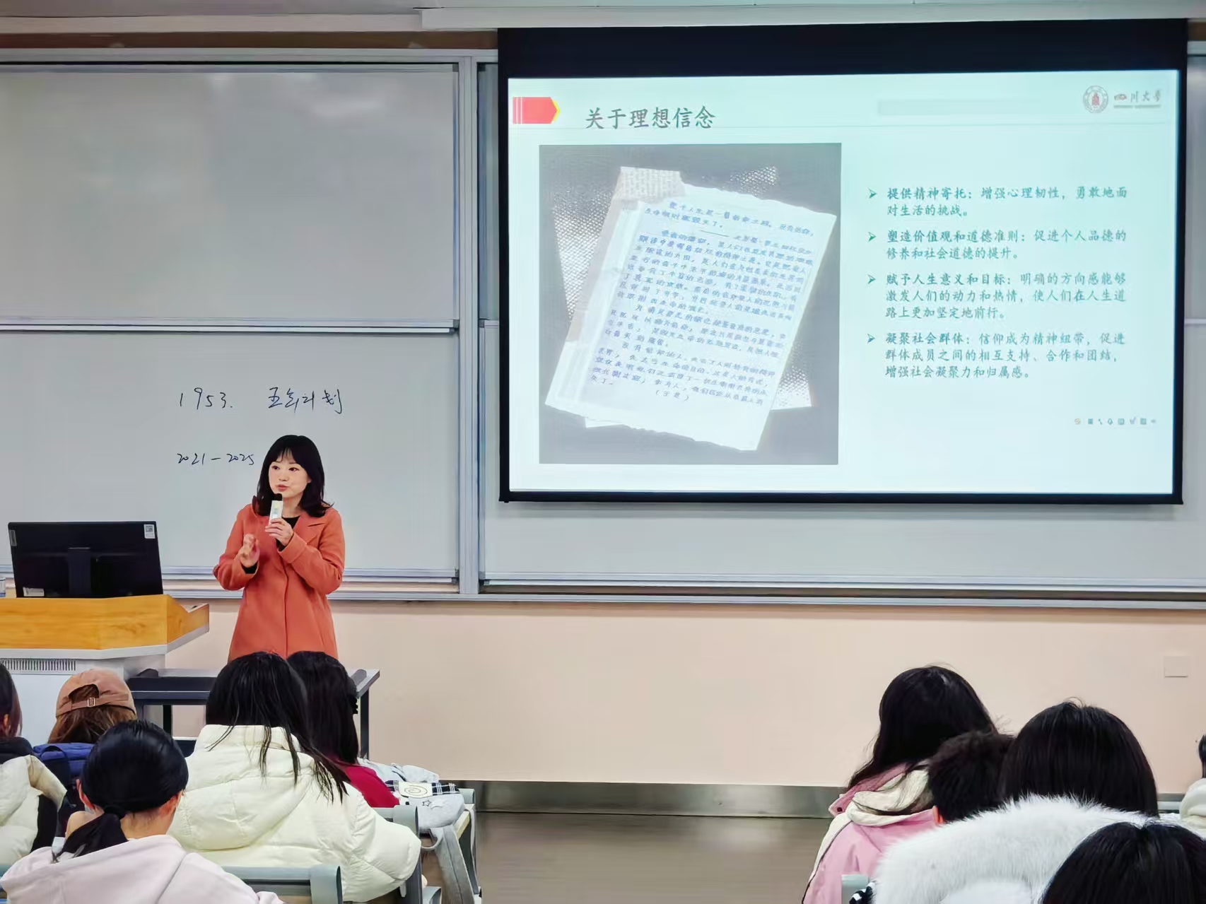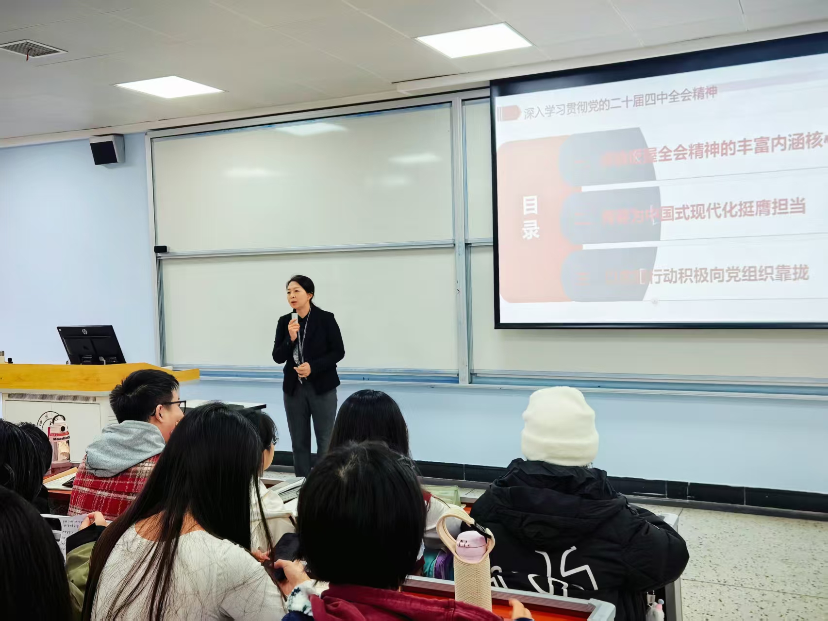 廖海燕老师用详实的数据与鲜活的实例,生动诠释了中国共产党的人民性本质与共产党员的先锋模范作用。川大有深厚的红色文化底蕴,身为川大学子,也应当赓续红色血脉,自觉向党组织靠拢。为此,廖海燕老师详细介绍了入党程序,如“一五三二口诀”、“五看三结合考察标准”等,为同学们树立远大理想、不断砥砺前行指明了方向。
