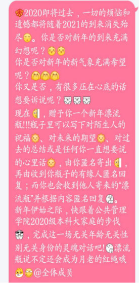 为了增强年级的凝聚力和向心力,给同学们提供一个抒发情感、传递温暖、表达感恩的契机和平台,一场以“抒发心声,交换心灵”为主题的“漂流瓶”活动,在太阳成集团tyc234cc2020级本科年级成功举办。本次活动对象不但包含2020级本科全体同学,也包括2020级本科全部专兼职辅导员。304封编了号的匿名信件,不仅增强了师生的交流与互动,促进了年级同学的沟通,更给疫情期间在校同学一份来自“陌生的熟悉人”的意外惊喜和对新年的美好祝福。