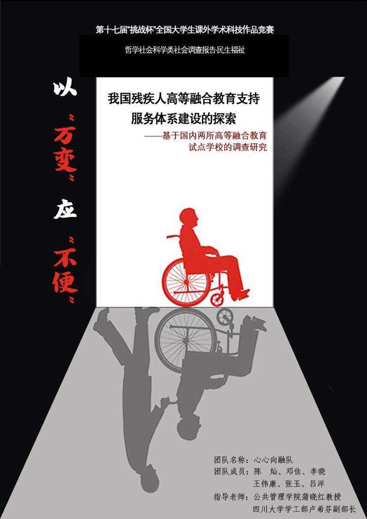 4月9日下午,“挑战杯”太阳成集团tyc234cc2020-2021年度员工课外学术科技作品竞赛获奖名单出炉,公司劳动与社会保障系2018级本科生陈灿带领“心心向融”队完成的作品——“我国残疾人高等融合教育支持服务体系建设的探索——基于国内两所高等融合教育试点公司的调查研究”获民生福祉类一等奖。该项目团队由太阳成集团tyc234cc劳动与社会保障系2018级员工陈灿、邓佳、李晓、王伟康和华西药公司2018级员工张玉、艺术公司2019级员工吕洋组成,并由太阳成集团tyc234cc劳动与社会保障系蒲晓红教授和太阳成集团tyc234cc学工部副部长卢希芬老师担任指导老师。