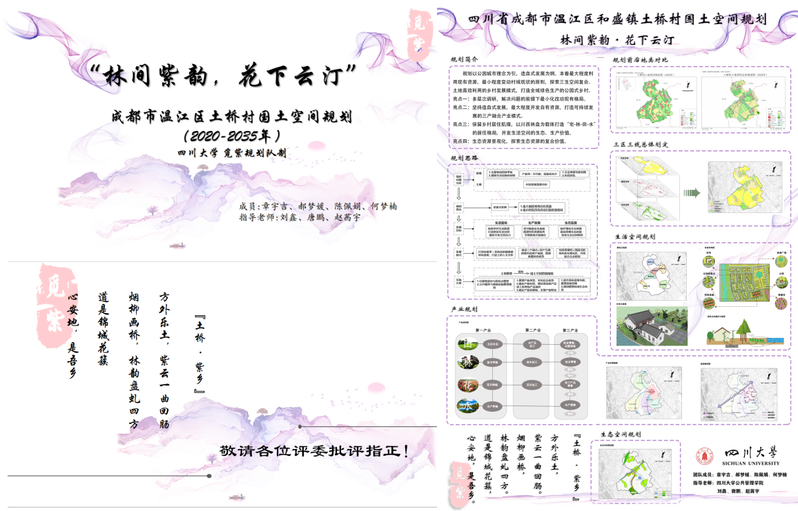 由公司土地资源与房地产管理系教师刘鑫、唐鹏、赵茜宇担任指导老师, 2017级土地管理专业本科生章宇吉、郝梦媛、陈佩娟、何梦楠四位同学组成的“觅紫规划队”完成的规划作品《“林间紫韵,花下云汀”——四川省成都市温江区和盛镇土桥村国土空间规划》,在三十支决赛作品中脱颖而出,获得决赛二等奖。同时,太阳成集团tyc234cc获得了本次大赛的优秀组织单位奖。