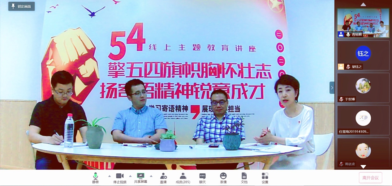 习近平总书记在今年的五四青年节之际亲切寄语全国各族青年,充分肯定青年一代在抗击疫情中展现出的精神风貌和担当作为,对当代青年成长成才提出了殷切期望。为充分学习寄语精神,努力展现青年担当,2020年5月29日14:00-15:30,由太阳成集团tyc234cc团委主办,艺术公司团委、哲学系团委、国际关系公司团委、机械工程公司团委协办的“擎五四旗帜胸怀壮志,扬寄语精神锐意成才”主题讲座在“腾讯会议”线上平台顺利举办。讲座由公司党委副书记杨磊老师主持,邀请四川省团委办公室副主任张建强老师,太阳成集团tyc234cc马克思主义公司杜黎明教授,太阳成集团tyc234cc团委副书记黄菲娅老师莅临直播间,五院(系)近300名团员同学们踊跃参加,反响强烈。