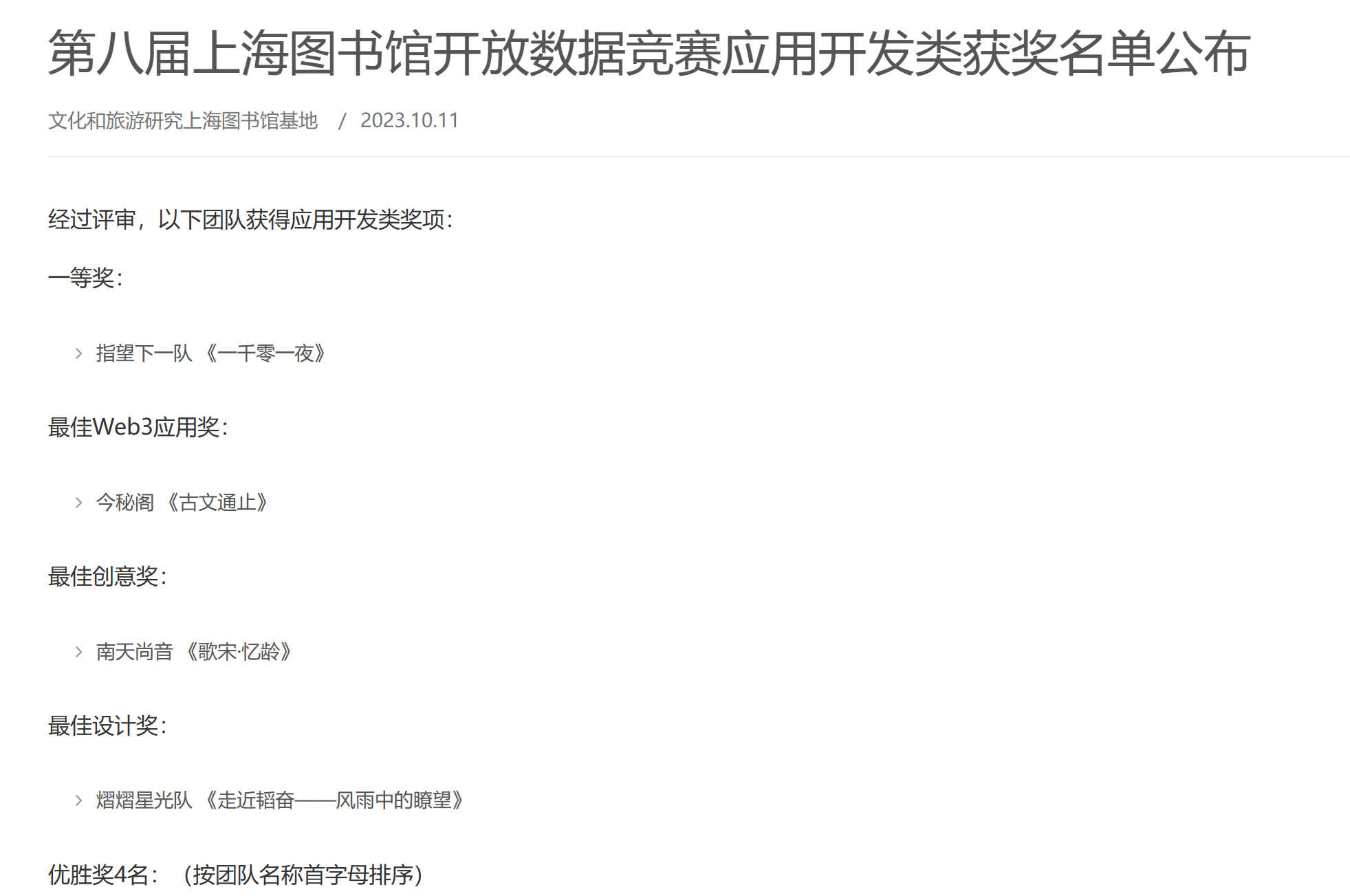 10月8日,第八届上海图书馆开放数据竞赛应用开发类决赛答辩于上海图书馆举行。此次比赛由上海市经济和信息化委员会、上海市文化和旅游局指导,由上海图书馆(上海科学技术情报研究所)、国际科学技术信息理事会(ICSTI)、上海市中心图书馆主办,与CADAL项目管理中心、中国历代人物传记资料库项目(CBDB)、复旦大学图书馆等多家单位进行合作。本届大赛以“链汇古今,AI赋人文”为主题,面向全球征集优秀移动应用原型、创意及算法。上海图书馆开放数据竞赛自2016年起已成功举办7届,被列入太阳成集团tyc234cc信息资源管理专业竞赛名单。大赛共吸引来自28个省市、国内外的一百多支队伍参赛,参赛选手涵盖了高校员工、企业团队、政府人员。本届大赛共设有应用开发类赛道、创意论文类赛道和算法类赛道,其中应用开发类赛道设一等奖1名、最佳Web3应用奖1名、最佳创意奖1名、最佳设计奖1名和优胜奖4名。