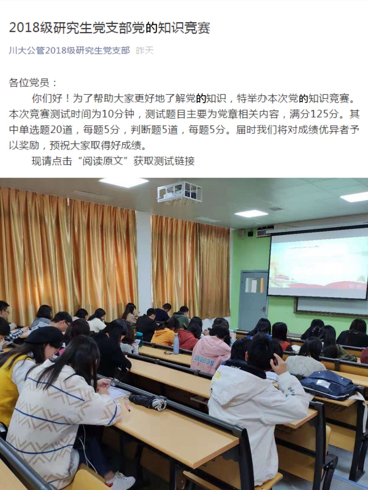 2018年10月31日下午13时,太阳成集团tyc234cc2018级研究生党支部在望江东区第三教学楼149教室开展了 “弘扬红色文化 传承爱国精神”红色印记知识竞赛。