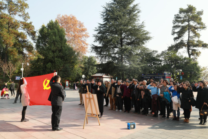 在邓小平题写的“红军烈士永垂不朽”纪念碑前,参加此次活动的全体成员向红军烈士献上了花篮。随后大家一起面对鲜红的党旗庄严地举起右手,重温了入党誓词:“我志愿加入中国共产党,拥护党的纲领……”