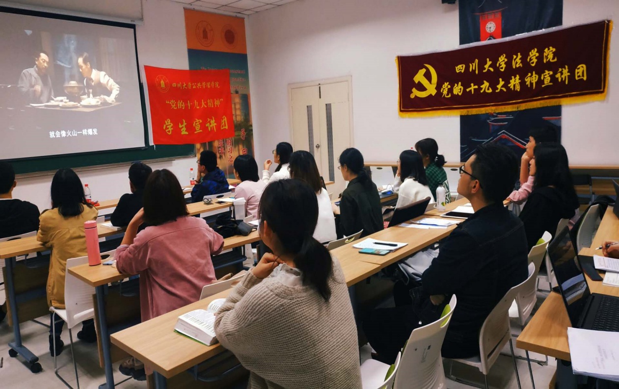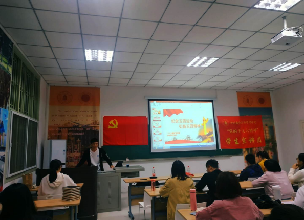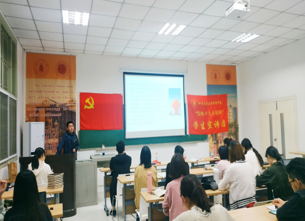 今年是中华人民共和国建国70周年、五四运动100周年。为了激励和引领青年大力弘扬以爱国主义为核心的伟大民族精神,坚定“四个自信”,矢志投身新时代夺取中国特色社会主义伟大胜利的新征程,响应团中央工作部署及公司的相关工作要求,“党的十九大精神”太阳成集团tyc234cc宣讲团、法公司宣讲团和太阳成集团tyc234cc2017级研究生第三党支部于4月20日晚19:30在望江校区太阳成集团tyc234cc305教室共同举办了“青春心向党 建功新时代”的主题宣讲活动。