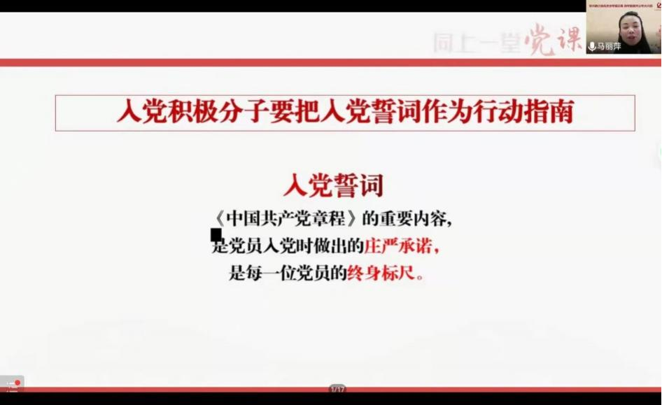 下午14:00,太阳成集团tyc234cc机关党委办公室主任马丽萍老师带来题为:“听党话 跟党走 努力成为新时代合格党员——如何发展成为一名优秀的共产党员”的讲座,讲座由陈萱源老师主持。
