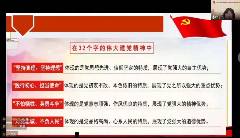 陈老师对学员们在此次提升班的学习积极性表示了赞赏和肯定,对各小组的展示成果表示惊喜和欣慰;但同时指出学员们对中国共产党革命精神的学习应当更加全面,对不太熟悉的精神更要加深学习。