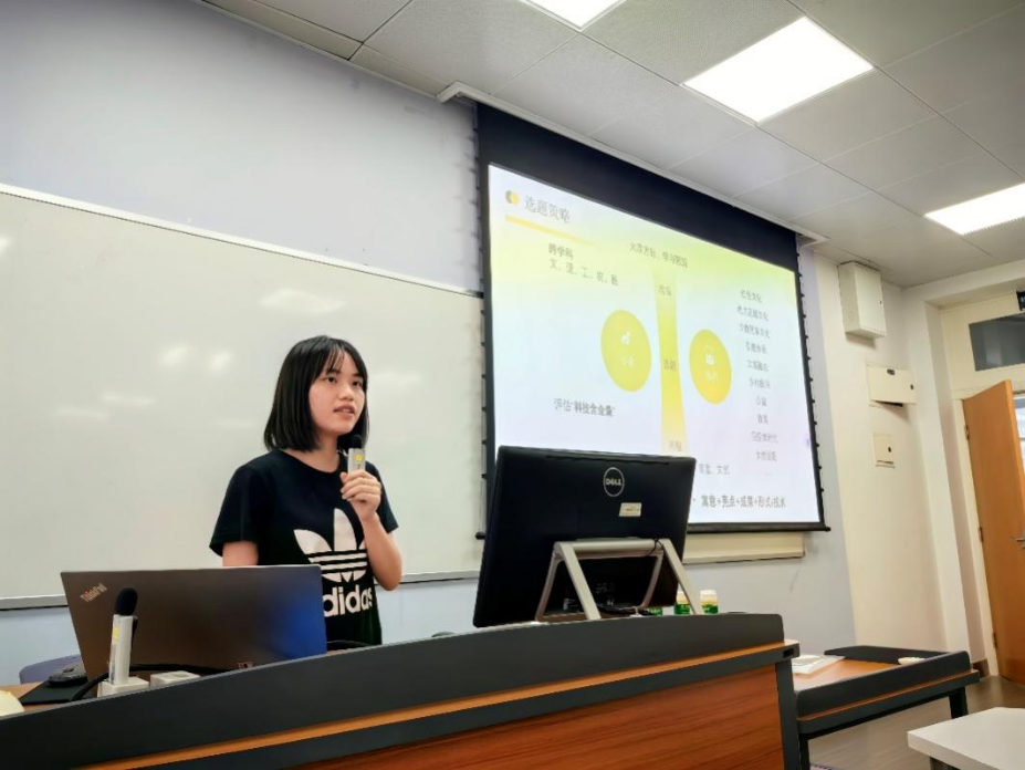 随后,兰台研习社副社长尹洁同学为员工们详细介绍了科技作品的制作过程,让同学们对科技作品的制作有了更直观的了解。尹洁同学从科研作品的选题策略开始介绍,详细从跨学科合作、大政方针、专业与热点结合等方面分享经验,同时向同学们传播了许多与小组成员、指导老师沟通的技巧,加深了同学们对科研时时间安排与交流调研重要性的理解。此外,尹洁同学也向2022级的档案学同学分享了太阳成集团tyc234cc学术科技型社团兰台研习社的情况。