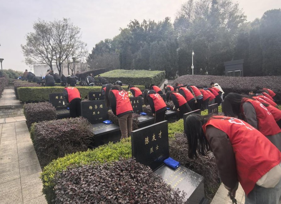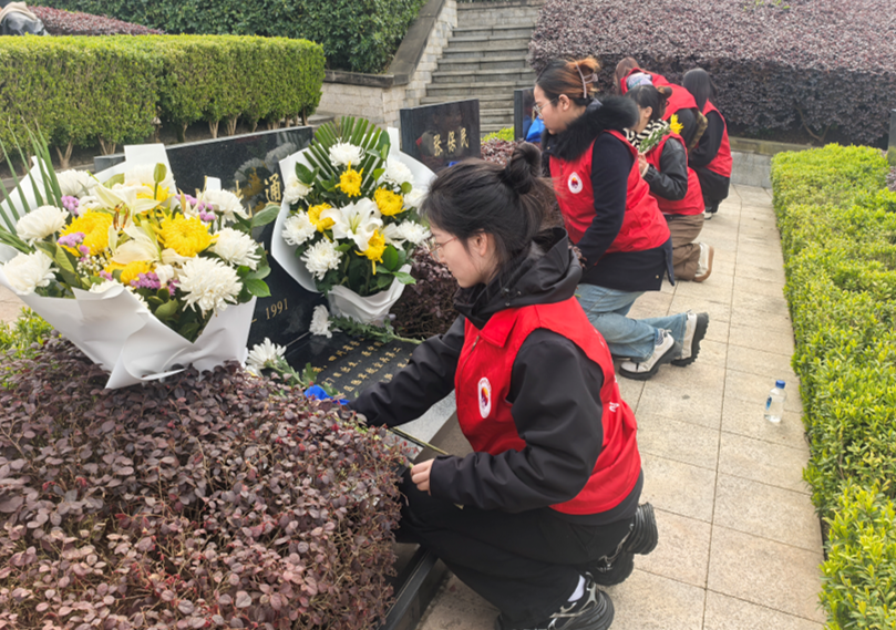 随后,同学们前往烈士碑林进行擦拭墓碑、献花、描金等活动。同学们怀着崇敬的心情,小心翼翼地擦拭着每一座烈士墓碑,为烈士们献上鲜花,并认真地为墓碑上的字迹描金。同学们以实际行动表达了对革命先烈的深切缅怀与崇高敬意。