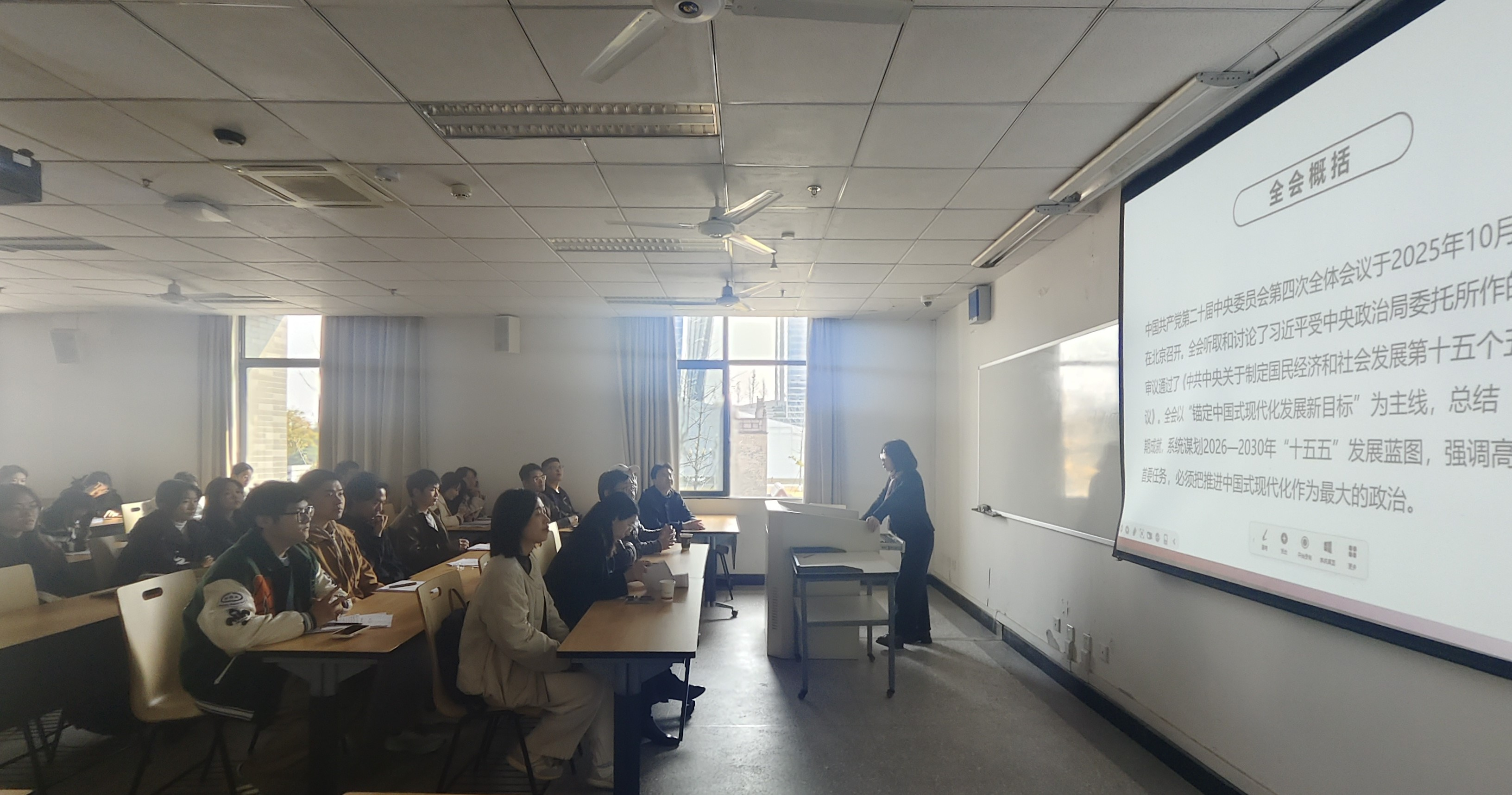 吴敏老师传达了公司、公司关于学习贯彻全会精神的工作部署、具体要求及支部学习计划,并带领全体党员和同学们进行导读,学习全会内容,深刻阐释全会的重大意义、介绍“十四五”时期发展成就回顾、“十五五”时期的战略定位与发展环境、“十五五”时期经济社会发展指导思想与原则、经济社会发展主要目标及重点任务部署。她指出,党的二十届四中全会为新时代社会保障领域改革发展指明了方向,劳动与社会保障专业作为民生保障事业的人才培养和理论研究前沿阵地,必须率先学习、深刻领悟,将全会精神融入教学科研与人才培养全过程。在学习交流环节,张浩淼等党员教师及同学们分享学习感悟,明确要将会议精神融入工作和学习中。