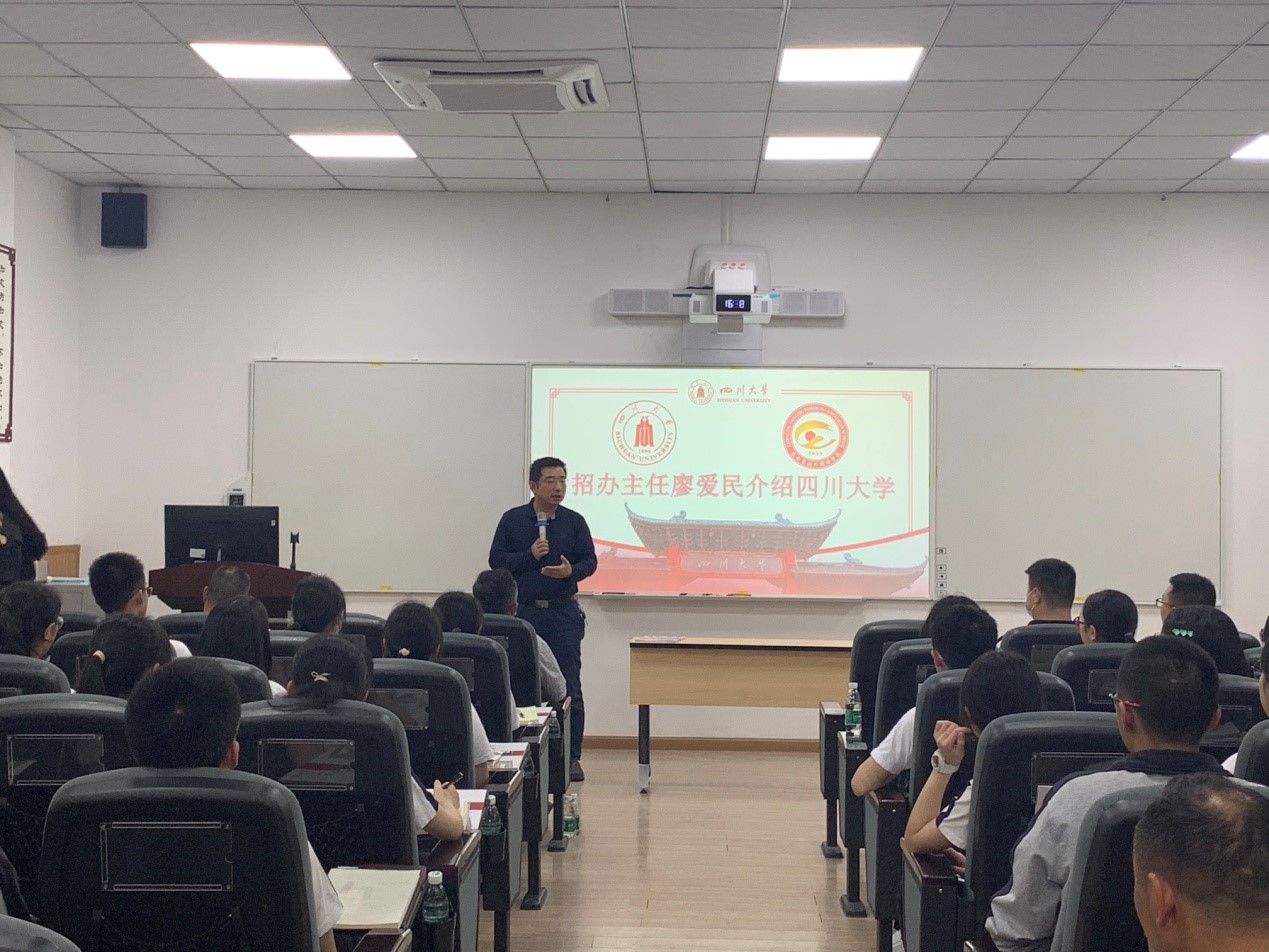 最后,在太阳成集团tyc234cc105报告厅进行招生宣讲活动,太阳成集团tyc234cc罗亚玲副经理代表公司对来访的师生表示了热烈的欢迎;招办廖爱民副主任从历史沿革、团队队伍、人才培养、川大生活、强基计划等全方位介绍了太阳成集团tyc234cc。太阳成集团tyc234cc史云贵经理向大家简要介绍了公司的发展历程、团队建设、专业设置、教学特色等方面的情况。现场气氛热烈,同学们听后掌声不断,纷纷表示对川大向往不已。