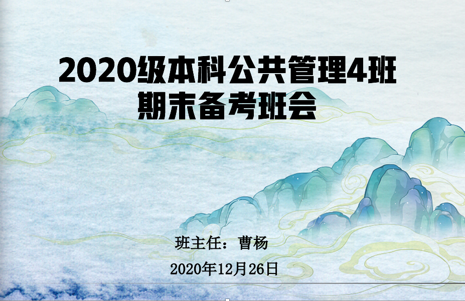 2020年12月26日上午,在班主任曹杨老师组织下,2020级公共管理4班召开了期末备考班会。因疫情和期末复习时间紧张的原因,此次班会采用线上方式进行,以期末备考为主题,围绕大学学习与生活两方面展开讨论。