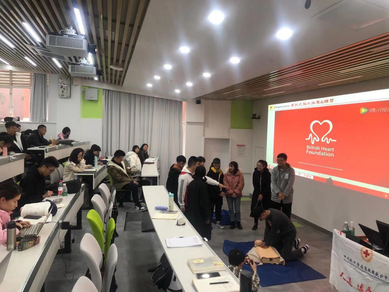 林久捷老师围绕红十字会相关情况、生存链含义、心肺复苏知识与操作方法、自动体外除颤仪原理及使用方法、意外伤害和常见急症处理办法等向学员全面讲授了应急救护相关知识,并与文盖老师一起带领学员进行现场练习。