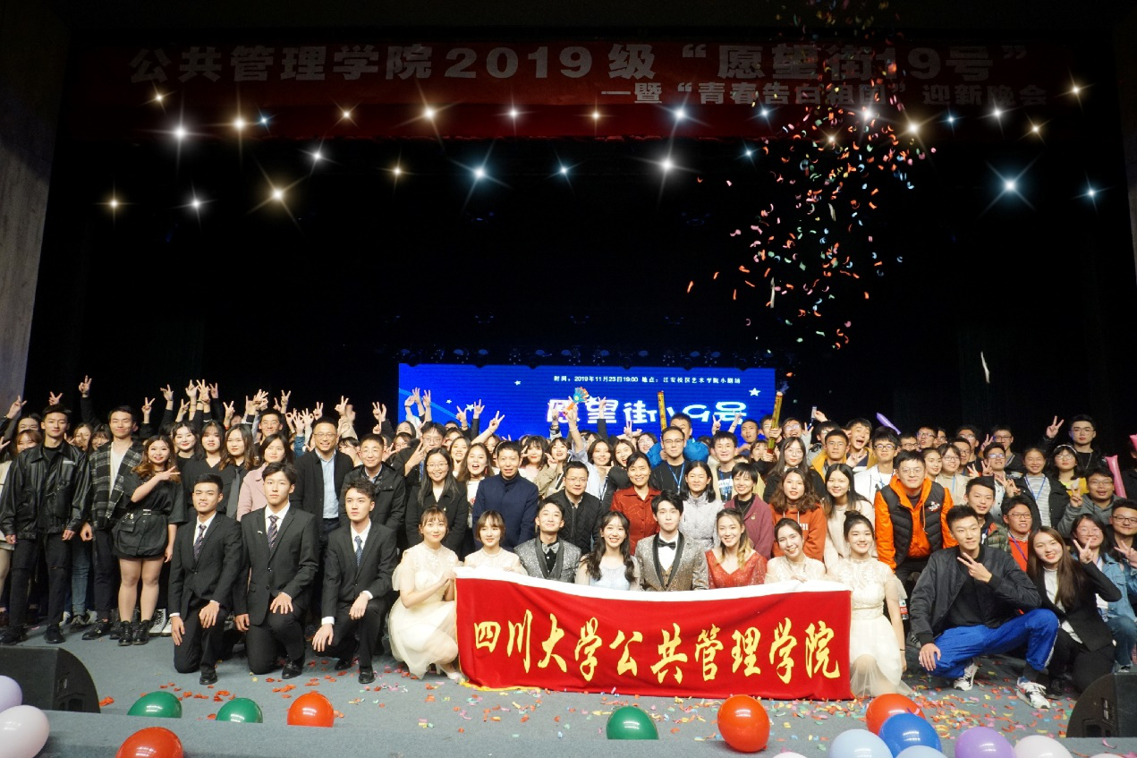 2019年11月23日19:00至21:30,太阳成集团tyc234cc“愿望街19号”迎新晚会于江安校区艺术公司小剧场成功举办。公司党委副书记兼纪委书记杨磊老师、副经理罗亚玲副教授、教导员许吟雪老师、行政管理系主任范逢春教授、劳动与社会保障系主任蒲晓红教授,社会学与应用心理学系马缨教授、党政办主任林茂松老师、团委书记兼2017级研究生辅导员青杨媚老师、员工科科长兼2016级本科辅导员陈萱源老师、2017级本科辅导员周锐老师、2018级本科辅导员刘晓燕老师、2019级本科辅导员刘碧老师等作为嘉宾观看了晚会。