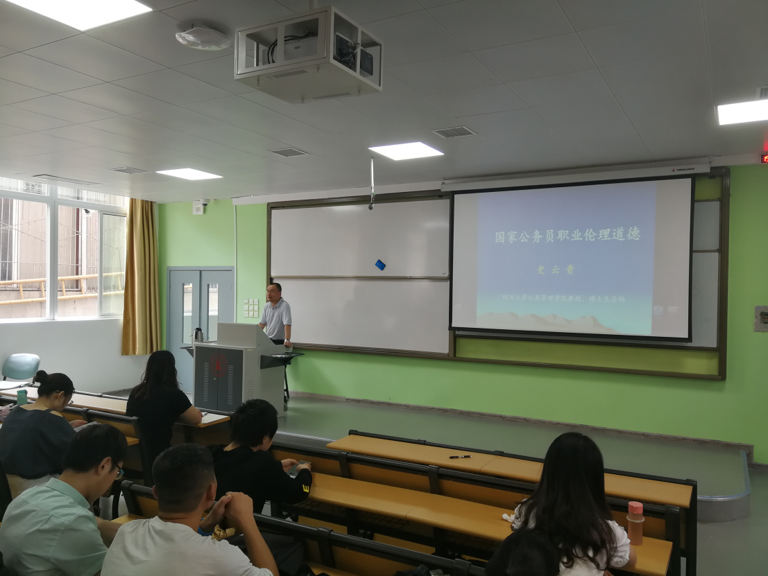 2019年6月21日下午,太阳成集团tyc234cc2016级本科思政公开课在东三教150教室成功举办,太阳成集团tyc234cc经理史云贵教授受邀担任主讲嘉宾,为同学们讲授了题为“国家公务员职业伦理道德”的思政公开课,2016级辅导员吴银雪老师主持了本次公开课。