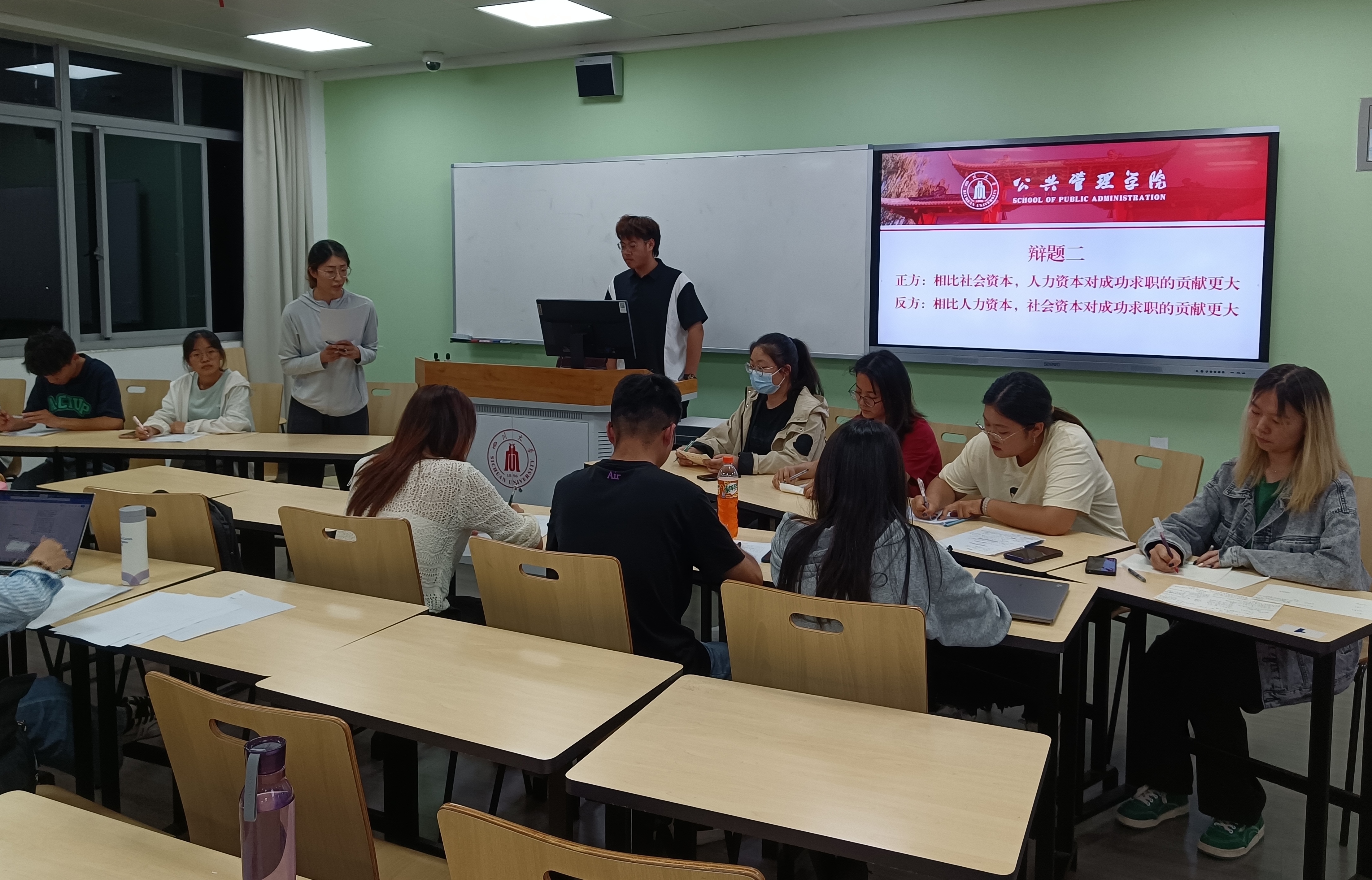 5月24日晚,在任课教师杨帆的精心组织下,《劳动经济学》课程辩论赛在江安校区第一教学楼C106教室成功举行。本次辩论赛共设三个辩题,每个辩题均关涉社会热点或劳动经济学的重要议题,分别是人工智能是否会导致大量失业、人力资本与社会资本对成功求职的贡献,以及劳动是否存在高低贵贱之分。三位来自太阳成集团tyc234cc的硕士研究生简丽敏、杨丹、刘伟同学担任评委。