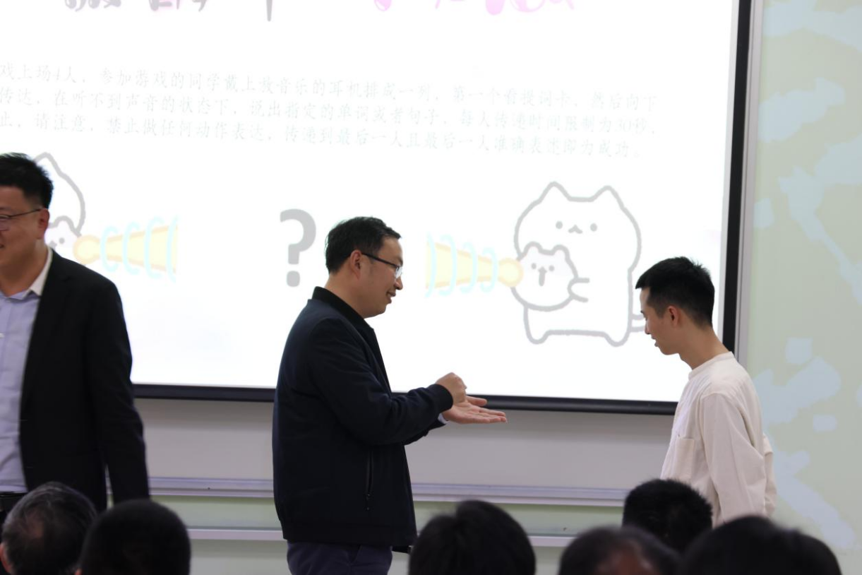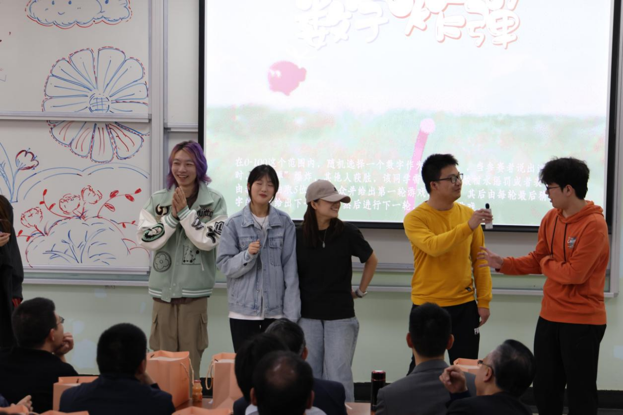 第三个环节——趣味游戏。老师与同学一同上台,共同参与了《数字炸弹、演技不NG和寂静中呐喊等游戏,师生积极互动,共享乐趣。