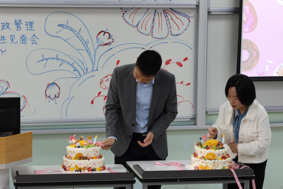 第二个环节——切蛋糕。行管班班委将两个蛋糕推入活动现场,范逢春老师和李晓梅老师上台同切蛋糕,点燃欢乐氛围。