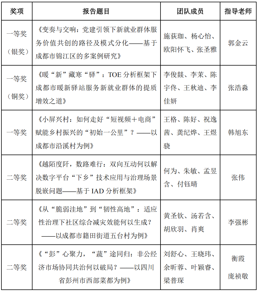 在公司行政管理系郭金云教授的指导下,由2023级劳动与社会保障专业本科生施荻珈、2023级行政管理专业本科生张圣雅、2023级行政管理专业本科生杨心怡和2023级土地资源管理专业本科生欧阳怀飞组成的“疯狂星期四”团队,凭借《变奏与交响:党建引领下新就业群体服务价值共创的路径及模式分化——基于成都市锦江区的多案例研究》案例分析报告,以总分第二的成绩斩获大赛银奖。