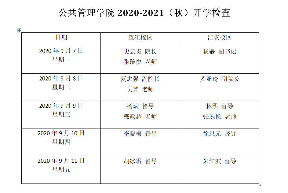 1、公司制定开学教学检查一周工作安排表,做到望江、江安两个校区全覆盖,并将开学教学检查责任落实到个人,全院正副职院领导、本科教学督导组成员、本科教务秘书、本科教学管理人员等参与检查。经理史云贵、副书记杨磊、副经理夏志强、副经理罗亚玲,本科教学督导组胡冰霜、徐恩元、杨斌、朱红波、李晓梅等老师、本科教务秘书林熙老师以及本科教学管理人员吴菁、戴政超、张琬悦等对新学期的课程安排与上课情况进行了检查。开学检查分设望江校区和江安校区两个部分,以下是公司制定并依之执行的开学教学检查安排表: