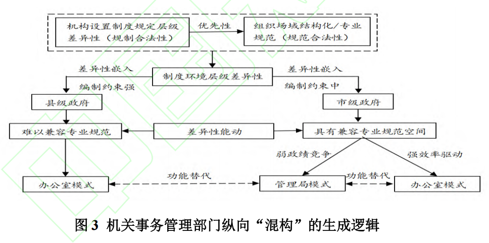 作为对内管理部门,机关事务管理部门具有独特性。考察机关事务管理部门的纵向职责配置既有助于系统认知各层级机关事务集中统一管理的情况,也能够丰富中国政府纵向职责体系研究。基于对 S 省机关事务管理部门的案例分析,主要结论如下:首先,机关事务管理部门纵向职责配置呈现“同责混构”的结构特征。其次,制度环境层级一致性下的组织选择是纵向“同责”的生成逻辑。追求规制合法性的强制性同构、追求规范合法性的规范性同构以及处理规制合法性与规范合法性张力的策略性同构共同形塑纵向“同责”。最后,制度环境层级差异性下的组织选择是纵向“混构”的生成逻辑。编制约束的差异性分割了专业规范的一致性:县级编制约束严苛,制度规制与专业规范无法兼容,只能选择政府办公室模式;市级政府编制约束相对宽松,制度规制与专业规范具有兼容可能性,领导注意力配置的差异性成为机构设置的调节变量,由此形塑纵向“混构”,而不同模式间的功能替代性又赋予纵向“混构”以结构合理性。